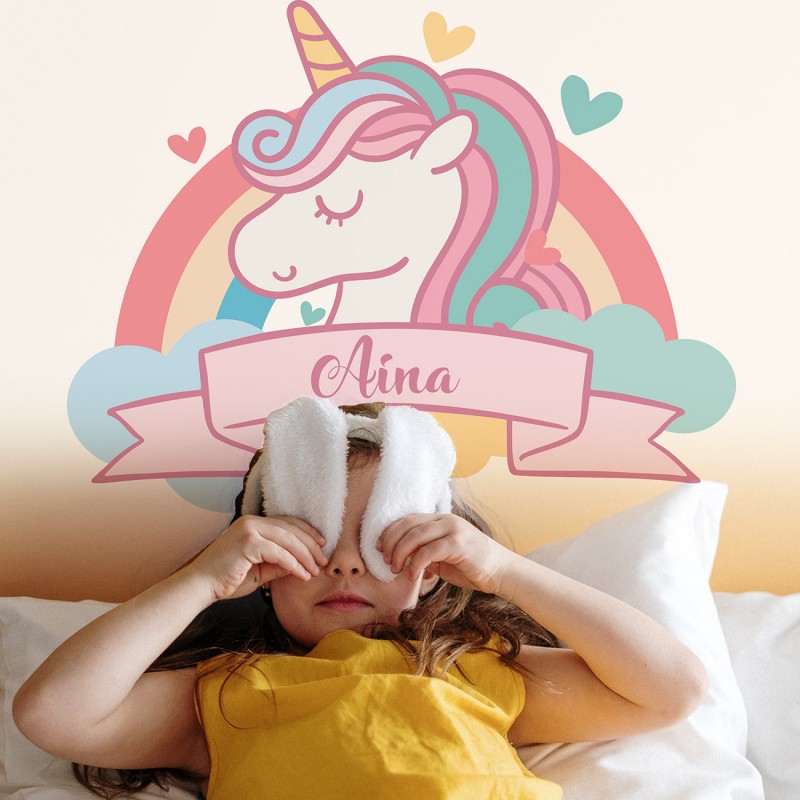 Vinilo decorativo personalizable con el nombre que quieras,bonito unicornio para tu pared. Un toque alegre i divertido para la habitación de los más pequeños.