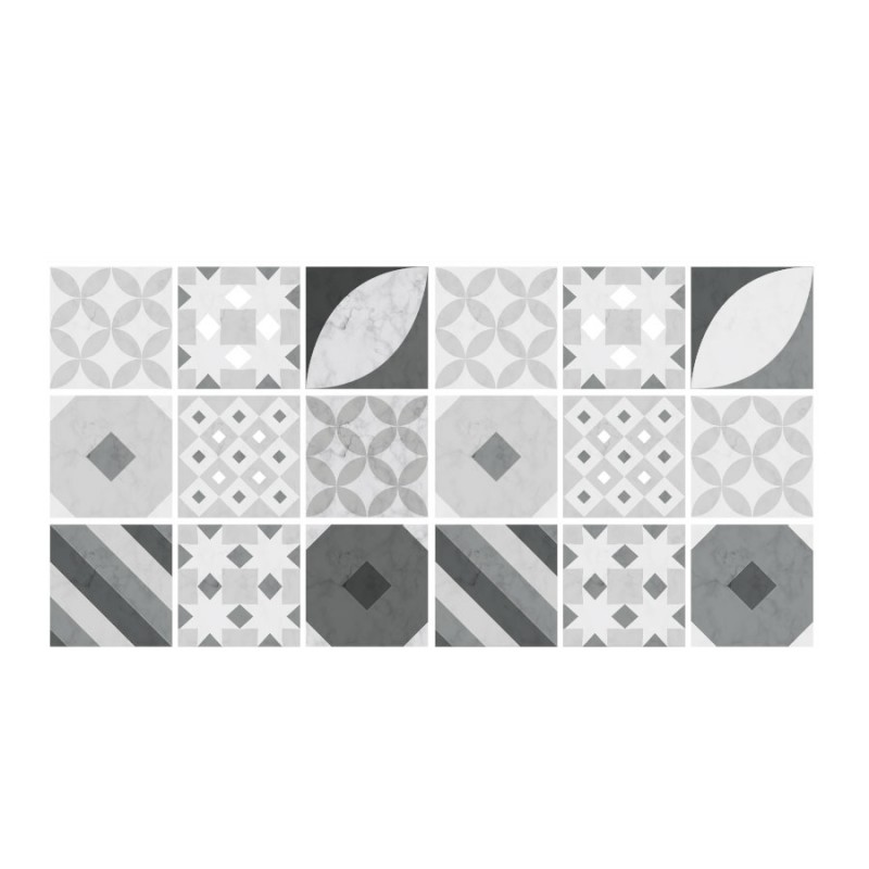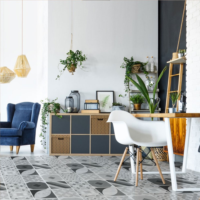 Adhesive vinyl for floors with hydraulic tiles. Protected with a textured non-slip laminate that provides safety and protection to erosion and cleaning. you can place aligned sheets so that they form the desired surface. Available in two formats.